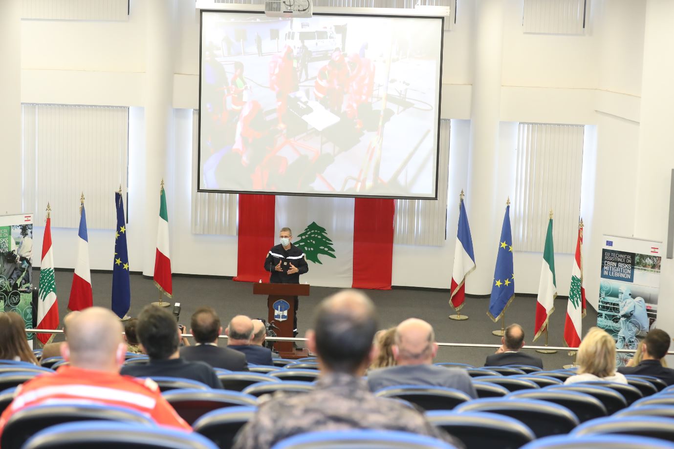 وتحدث ممثل بعثة الاتحاد الأوروبي فقال: “نحتفل اليوم باختتام مشروع ناجح للغاية، ممول من الاتحاد الأوروبي، وتم تنفيذه مع شركائنا اللبنانيين وبمساعدة دولتين من الدول الأعضاء إيطاليا وفرنسا، وتديره شركة B&S Europe. لقد أدى المشروع إلى زيادة المعرفة في المؤسسات اللبنانية بشأن المخاطر الكيميائية والبيولوجية والإشعاعية والنووية. ونتيجة لذلك، تم تدريب أكثر من 820 ممثلا من ست مؤسسات مختلفة: الجيش اللبناني، رجال الإطفاء في بيروت، الدفاع المدني، قوى الأمن الداخلي، الحرس الحكومي والصليب الأحمر اللبناني”.