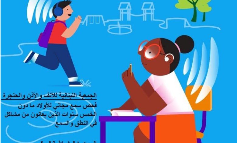 بمناسبة اليوم العالمي للسمع ، تنظم الجمعية اللبنانية للأنف والأذن والحنجرة بالتعاون مع مستشفى تل شيحا حملة فحص سمع مجاني للأولاد ما دون الخمس سنوات الذين يعانون من مشاكل في النطق والسمع، يوم السبت 28 شباط 2026 من الساعة 11 قبل الظهر ولغاية الساعة الواحدة ظهراً في مستشفى تل شيحا.